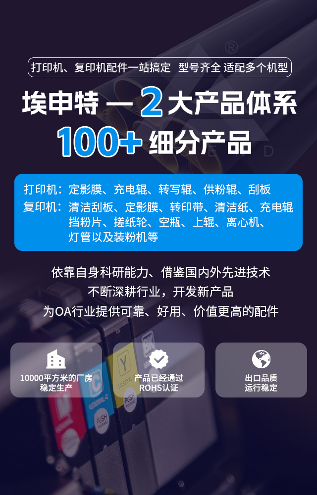 埃申特推出的打印機、復印機、定影膜、充電輥等產品經過市場驗證,贏得眾多客戶的青睞,出口至亞、歐、美、非、大洋洲等十幾個國家和地區